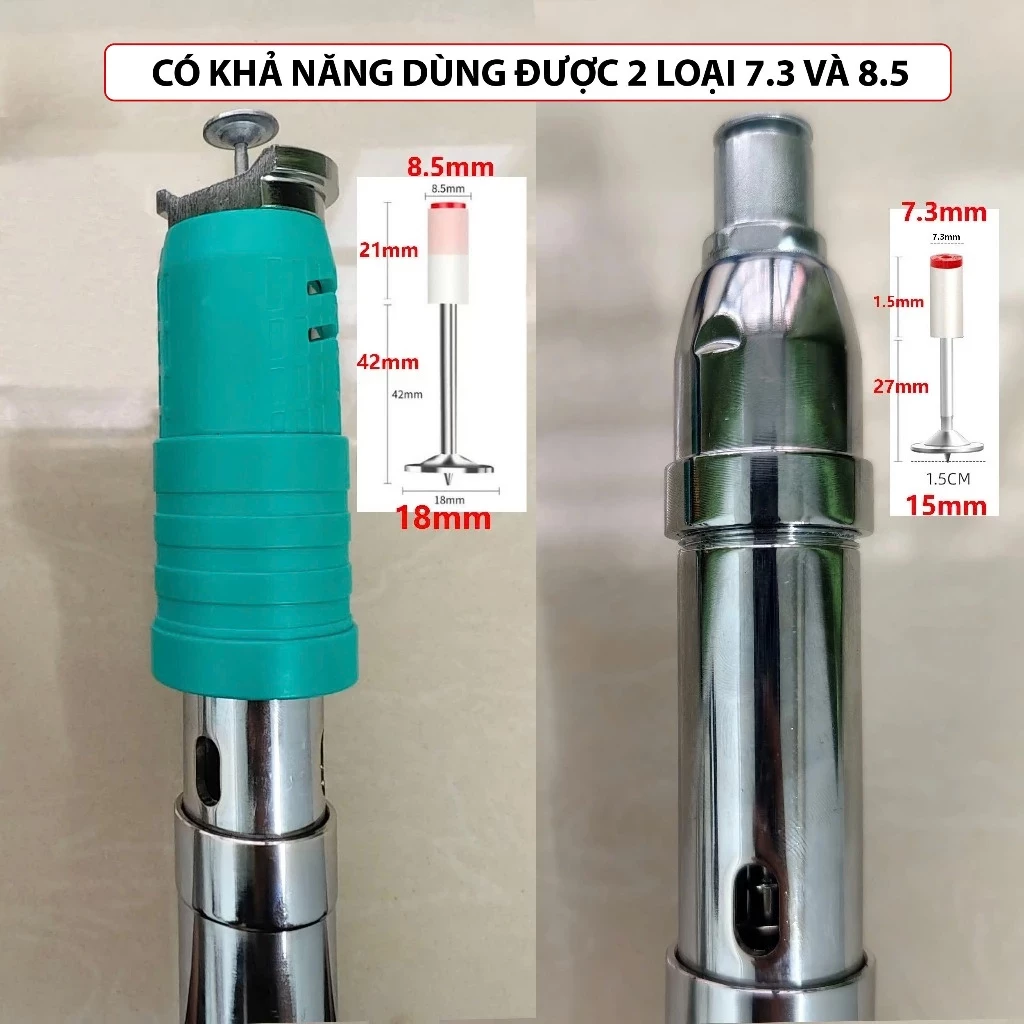2x Đầu nòng (Có thể thay thế hai bộ đầu nòng theo ý muốn, tương ứng với đinh có đường kính 7,3mm và 8,5mm, Sản phẩm này đã lắp sẵn đầu nòng 7,3mm, nếu đinh của bạn là 7,3mm, thì bạn có thể cắm trực tiếp vào Vào đinh để sử dụng dụng cụ bắn đinh, nếu đinh của bạn là 8,5mm, thì bạn cần thay thế mõm bằng mõm 8,5mm)