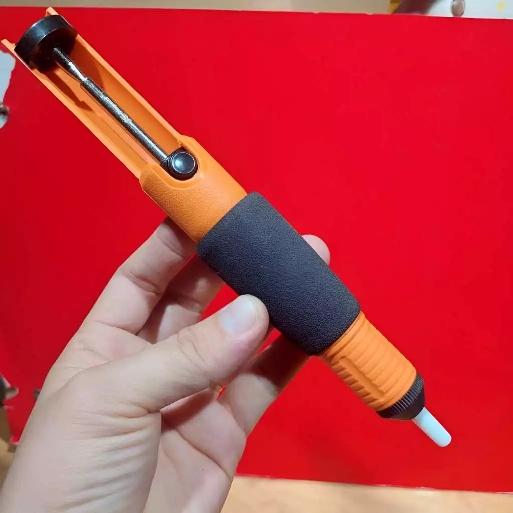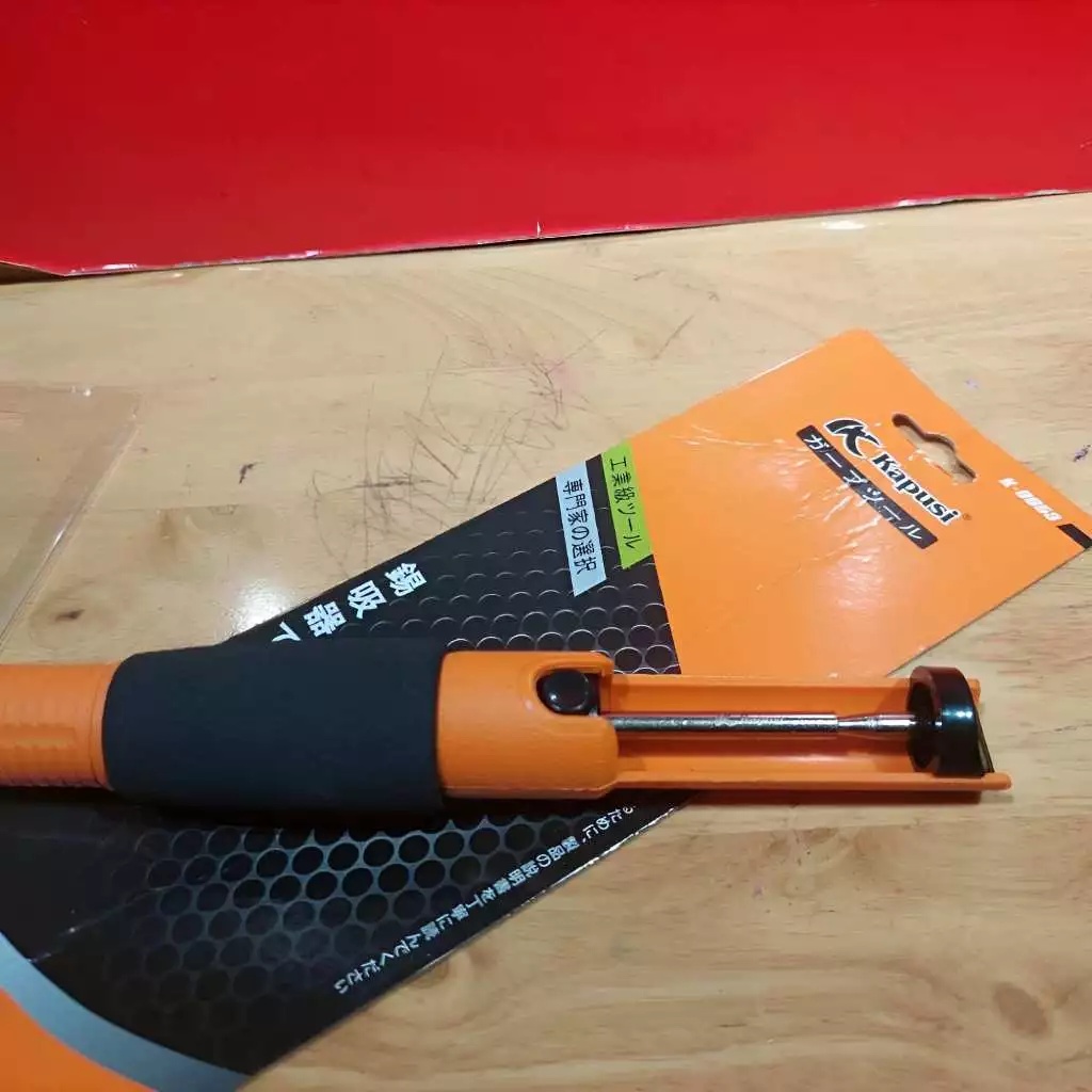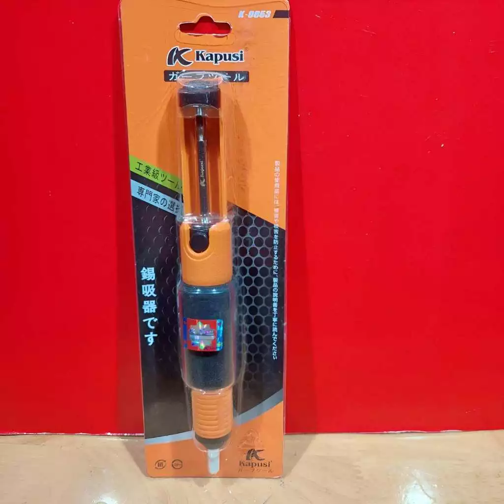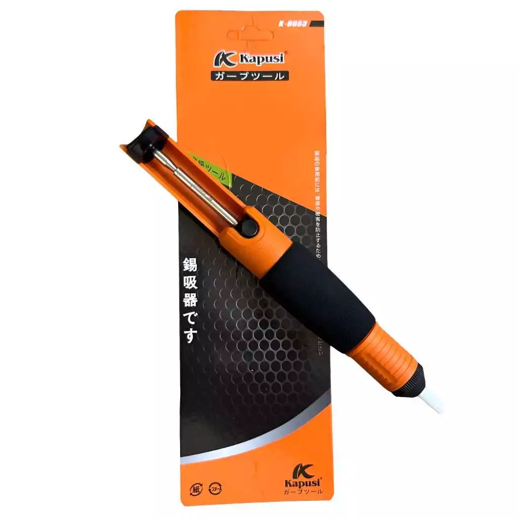 Máy hút chì hàn Kapusi K-9053 có thiết kế với màu sắc cam đen nổi bật và đóng gói theo quy cách thẻ vỉ, tiện lợi cho việc lưu trữ và vận chuyển.