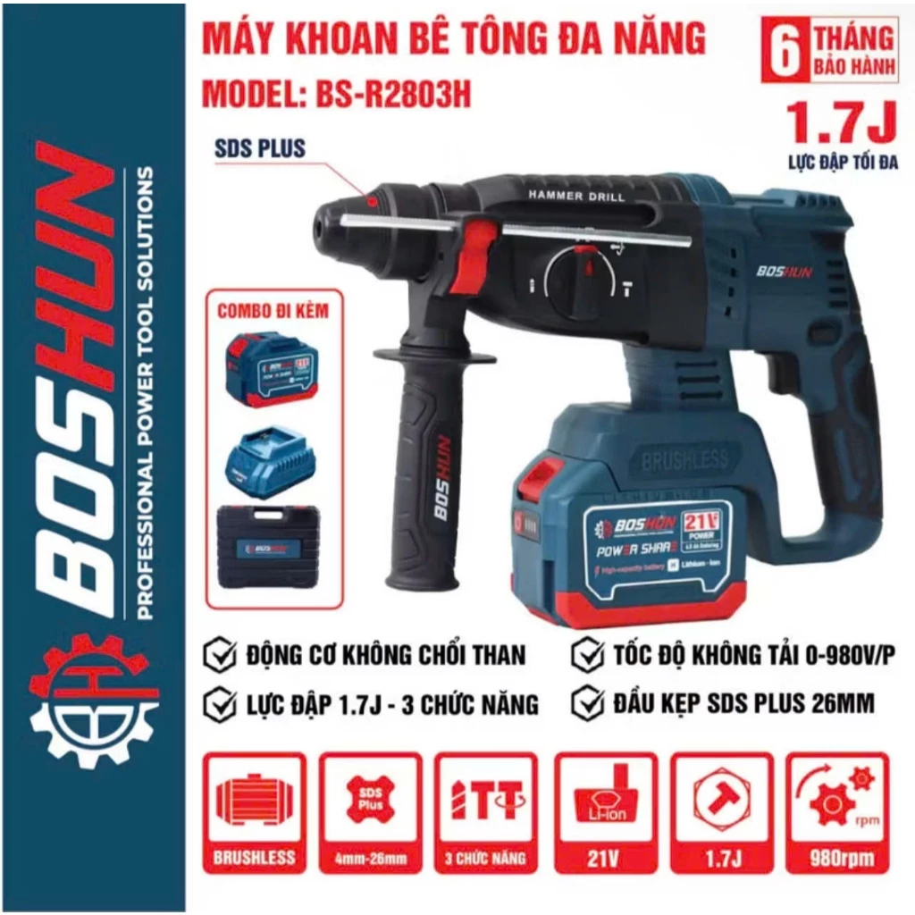 - Tên sản phẩm: Máy Khoan Đục Bê Tông Pin BOSHUN BS-G2803H, Động Cơ Không Chổi Than, Lực đập 1.7J