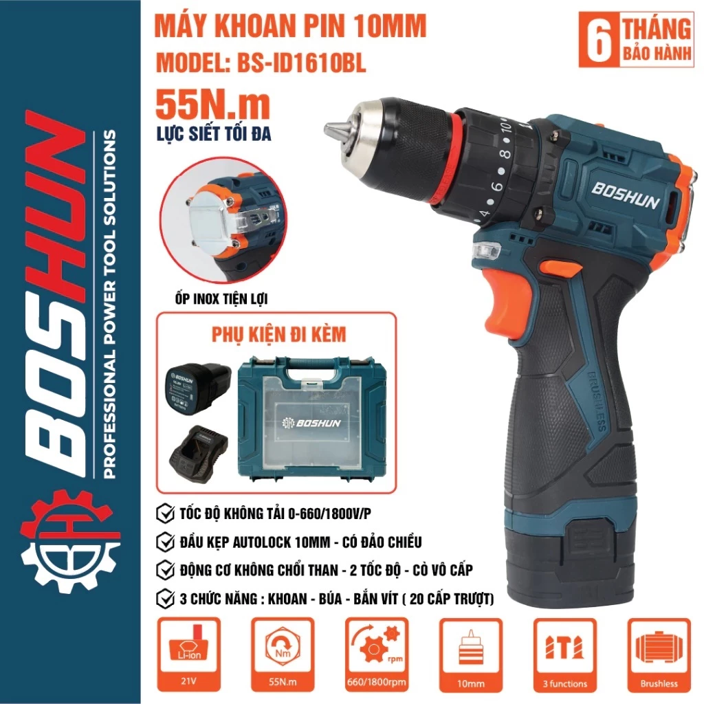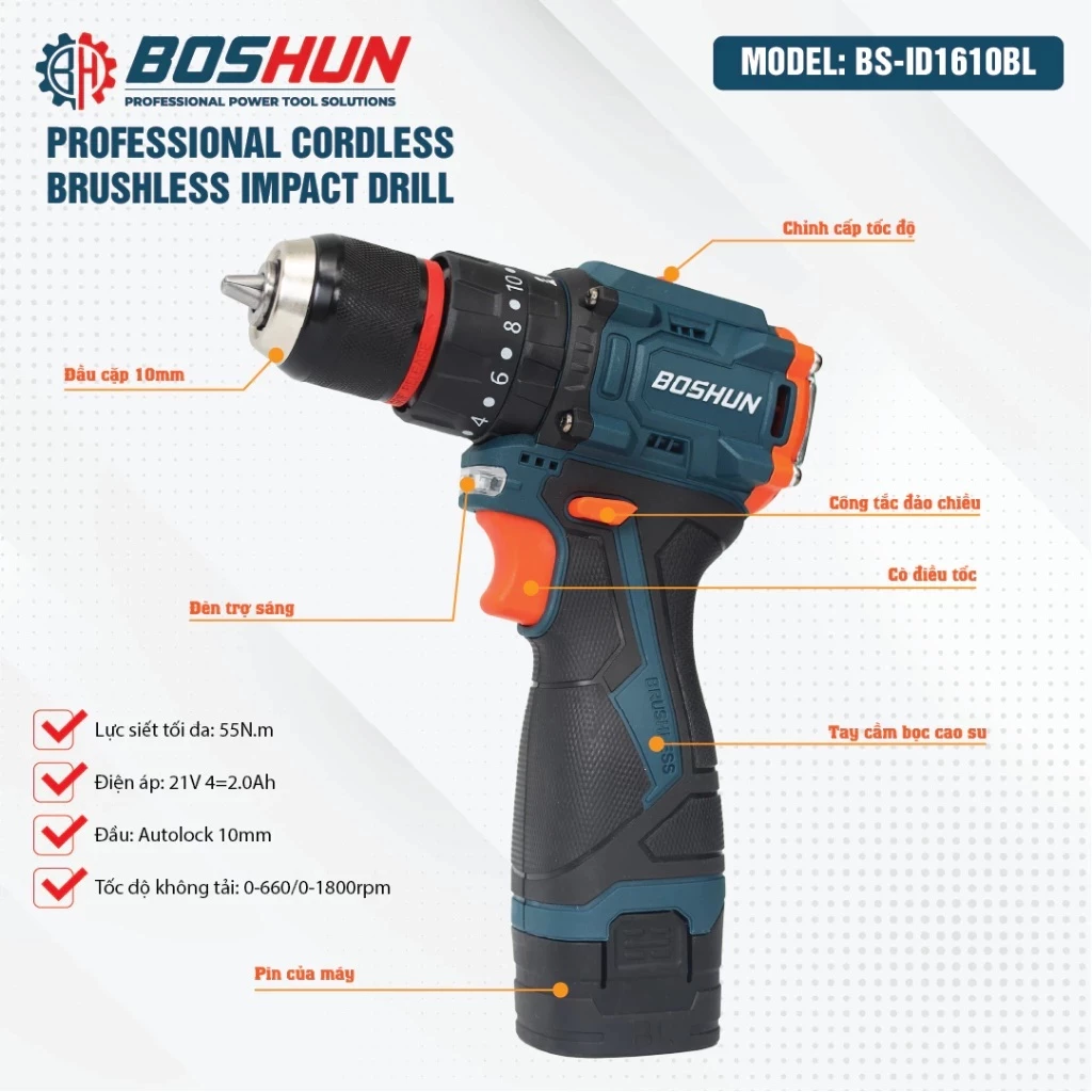 - Tên sản phẩm: Máy khoan pin BOSHUN BS-ID1610BL, Không chổi than, Chuyên khoan bê tông, khoan tường, sắt, gỗ, bắt vít, Có khóa trục
