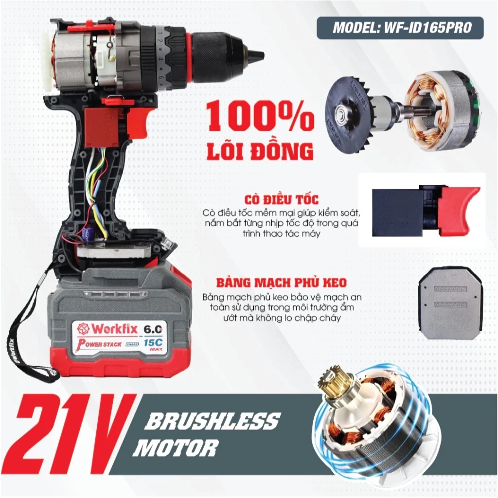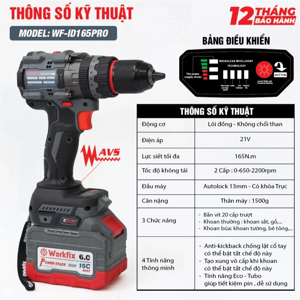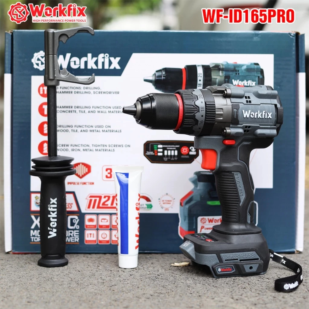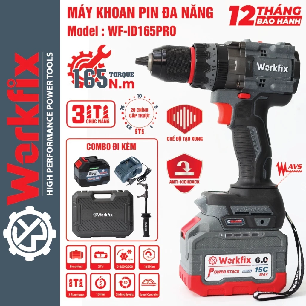 - Tên sản phẩm: Máy Khoan Pin WORKFIX WF-ID165PRO , Không chổi than, 165Nm, 3 Chức năng, Có ANTI-KICKBACK + TẠO XUNG