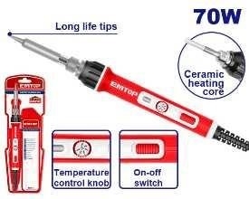 | Điện áp: 220-240V~50/60Hz Công suất đầu vào: 70W Thời gian làm nóng trước: 120 giây Đầu thẳng, có đầu nhọn Nhiệt độ có thể điều chỉnh bằng cách xoay Bộ phận gia nhiệt bằng gốm tích hợp cho khả năng gia nhiệt nhanh và ổn định, dễ dàng thay thế Kèm theo một miếng đệm Đầu nhọn có thể thay thế, tuổi thọ cao |