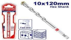 | Đường kính: 10*120mm Cán lục giác Loại bỏ bụi mịn, khoan cực kỳ hiệu quả Thích hợp để khoan bê tông xi măng, gạch và khối Đóng gói bằng vỉ đôi |
