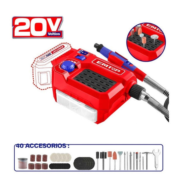 | Điện áp: 20V Tốc độ không tải: 5000-33000RPM Kích thước kẹp: 3,2mm Điều khiển tốc độ thay đổi Với 40 phụ kiện Với 1 trục linh hoạt Đóng gói bằng hộp màu |