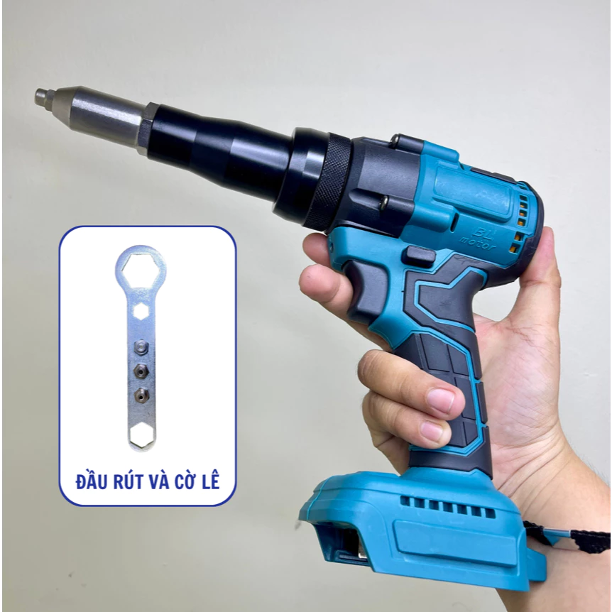 - Máy kèm theo 4 đầu rút: 2.4mm, 3.2mm, 4.0mm và 4.8mm, (3 ĐẦU TRÊN TRÊN CỜ LÊ, 1 ĐẦU SẲN TRÊN MÁY) phù hợp sử dụng với đinh rive nhôm